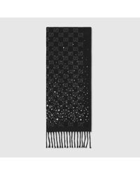 Weiter zu GucciDie Cruise 2026 Kollektion für Damen präsentiert Accessoires aus weichen Stoffen, die Einflüsse aus den Archiven mit dem opulenten Stil der 1990er verschmelzen lassen. Dieser Schal aus GG Wolle mit Kristallen wird von