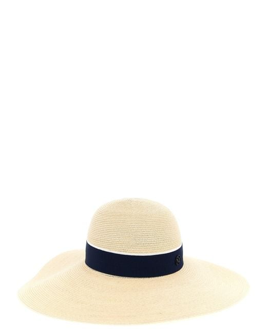 Breitkrempiger Strohhut von Blanche mit doppeltem Ripsband und einem Metalllogo vorne. The Iconics"-Kollektion. Handgefertigtes Produkt, etwaige Unvollkommenheiten gelten als Merkmale der Einzigartigkeit. MAISON MICHEL. 'Blanche'-Hut. Größengetreue Passform. S: 56 cm. M: 58 cm. B: 60 cm. Farbe: weiß