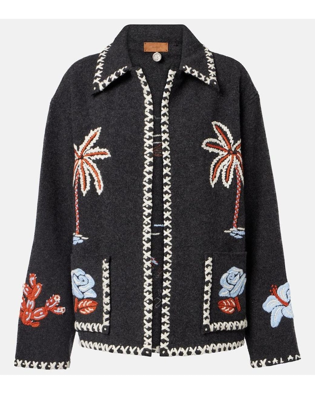 Material: 100% Schurwolle. Pflegehinweis: chemische Reinigung. Made in Italy. Designer-Farbbezeichnung: Charcoal/Multicolor. Artikelfarbe: Grau, multicolor. Stickerei: 100% Wolle. Wolle. Taschenart: aufgesetzte Taschen. Verschlussart: offene Vorderseite. Inklusive: Staubbeutel.