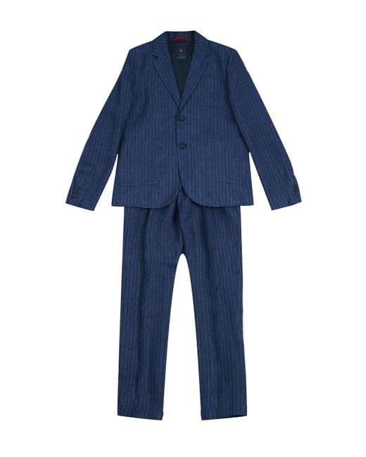Baumwollmischung - einfacher Stoff - Nadelstreifenmuster - Doppelknopfjacke - verehrter Kragen - Taschen vorne Klappen - Lange Ärmel mit Knöpfen an der Manschette - reguläre Taillenhosen mit Gürtelschlaufen - Button und Reißverschlussfliegenverschluss - Flecken auf vorderen und hinten - Rücken - Rücken -Gründungstasche - gerade Saum - normal. Farbe: blau