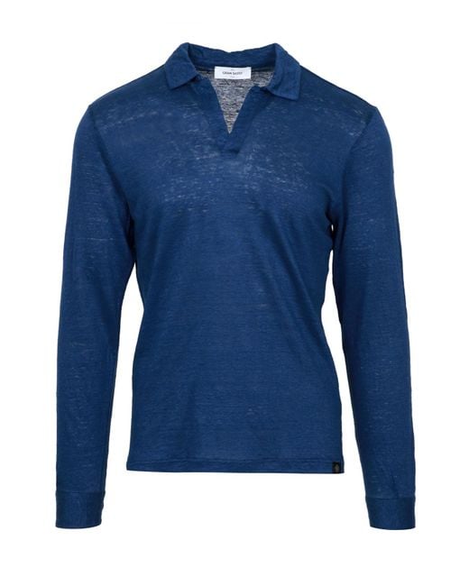 Leinen - strukturierter Stoff mit einem Halbgloss Finish - Klassiker Spitzkragen - V -Ausschnitt - Langarm mit Knopfmanschetten - Logo -Patch an der unteren Vorderseite - gerade Saum mit Schlitzen an den Seiten - normale Passform - in Italien hergestellt. Farbe: blau