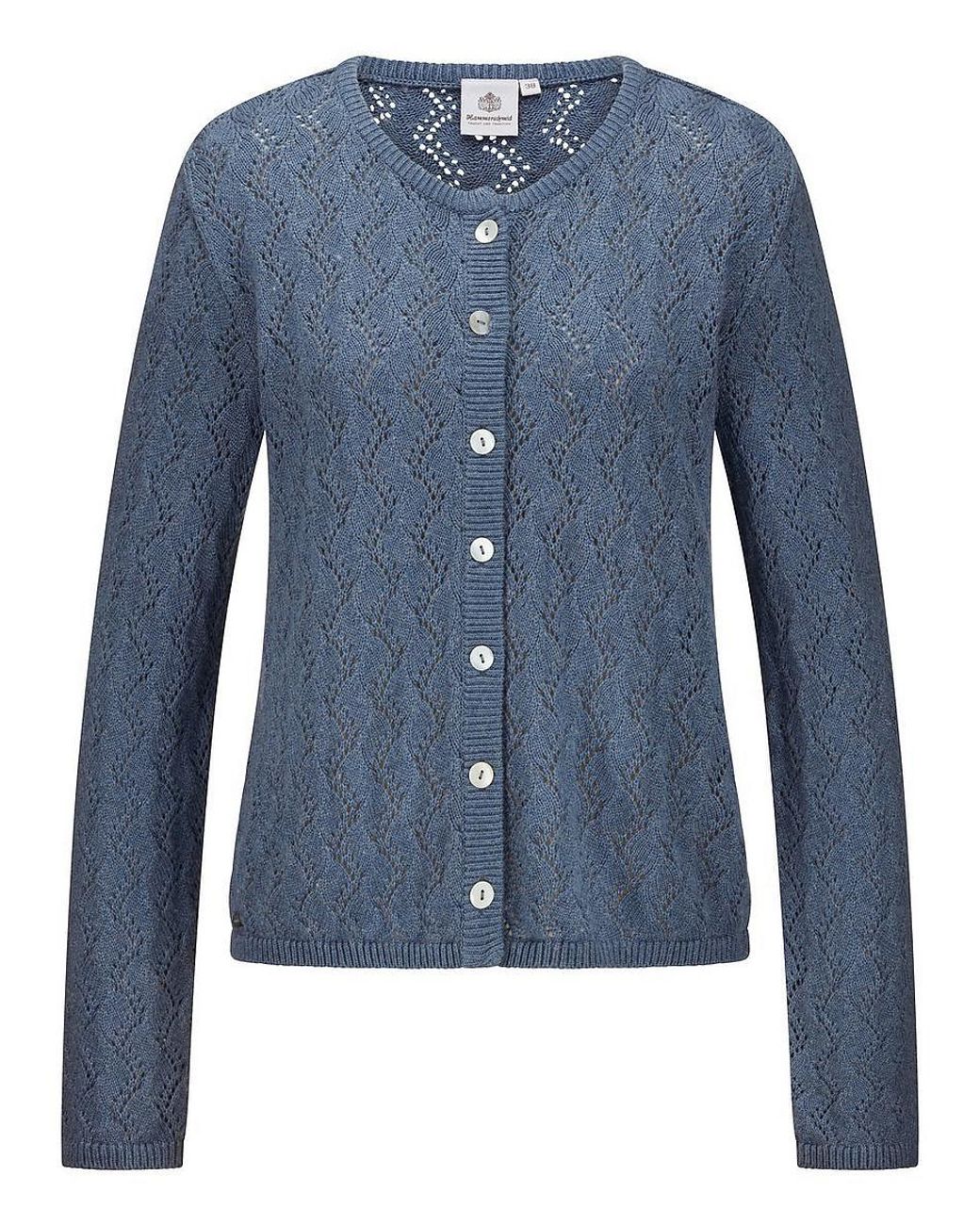 Strickjacke "Wachau" von HAMMERSCHMID mit Rundhals-Ausschnitt und 1/1-Arm. Liebevoll gestrickt aus einer hochwertigen Garnmischung in leicht transparentem Ajour-Muster mit gerippten Abschlüssen. 50% Baumwolle, 43% Viskose, 7% Wolle. Länge ca. 54 cm. Bei dieser Strickjacke empfehlen wir Handwäsche. Handwäsche. Chlorbleiche nicht möglich. Nicht heiß Bügeln. Reinigung P. Trocknen im Tumbler nicht möglich. Farbe: Blau-Melange. 50% Baumwolle, 43% Viskose, 7% Wolle.