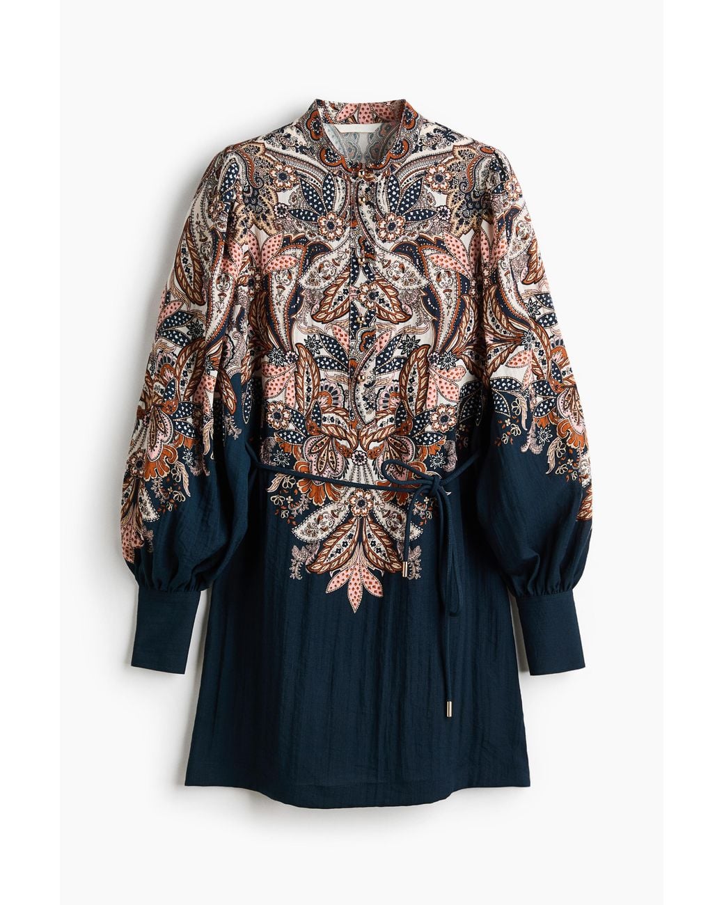 Kurzes Kleid aus Viskosemischgewebe mit Bandkragen und kugelförmigen Metallknöpfen bis zur Taille. Voluminöse Ballonärmel mit breiter Manschette, Schlitz und Knopf, ein schmaler Bindegürtel in der Taille und ein leicht ausgestellter Saum. Ungefüttert. Farbe: blau