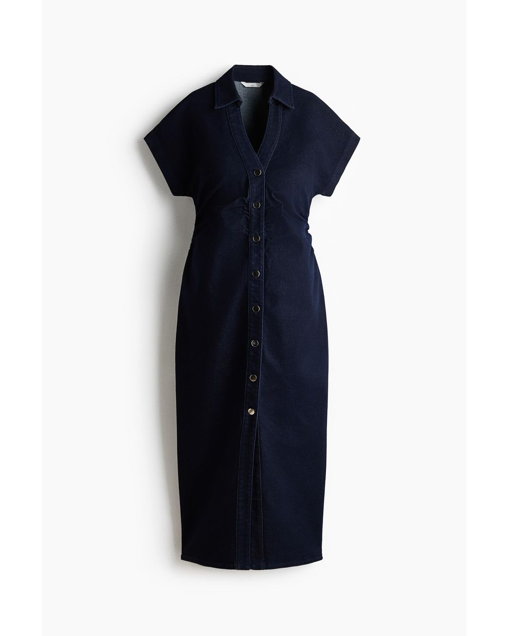 Knöchellanges, figurbetontes Denimkleid mit offenem Kragen, durchgehender Knopfleiste und kurzen Ärmeln. Raffungen an einer Seite der Taille erzeugen einen leicht drapierten Effekt. Farbe: blau