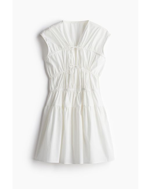 Kurzes ärmelloses Kleid aus griffigem Baumwollpopeline mit tiefem V-Ausschnitt mit zwei schmalen Kordelzugreihen zum Binden. Schmaler Gummizug in der Taille und ein ausgestelltes Jupeteil mit gerafften Stufen für zusätzliches Volumen. Ungefüttert. Farbe: weiß