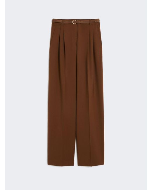Lange Hose mit doppelten Bundfalten vorne, davon verläuft eine sanft und die andere bis zum Saum mit Falten-Optik. Hose aus reinem Wollcanvas mit natürlichem Stretchanteil Fließende Silhouette, am Saum leicht geschlossene Passform Hoher Bund, Reißverschluss mit Patte und Häkchen Schräg angesetzte, seitliche Eingriffstaschen Passender Taillengürtel Mit Zierstick-Finish Farbe: braun