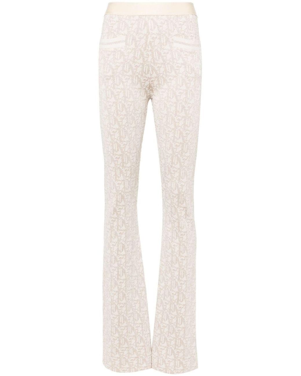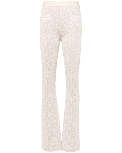 Leichter beige, goldfarbenes gestrickes Konstruktion Metallic Fadenmonogramm Jacquard gestreiftes elastisches Logo Bund Zwei vorder. Dieses Stück passt zu der Größe. Wir empfehlen Ihnen, Ihre reguläre Größe zu erhalten. Das Modell beträgt 1,75 m / 5ft 8 -Zoll S.