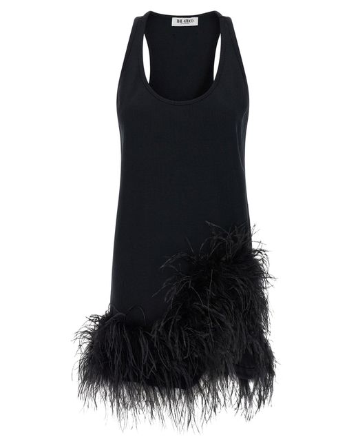 Minikleid aus gerippter Stretch-Baumwolle, Tanktop mit weitem Rundhalsausschnitt vorne, ärmellos, Saum mit geformtem Schlitz vorne und Ton-in-Ton-Marabu-Federapplikation. DAS ATTICO. Federkleid. Größengetreue Passform.
