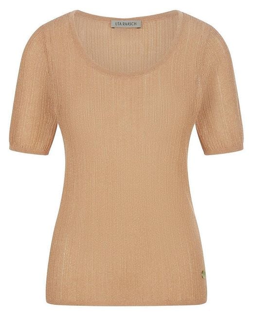 Pullover von UTA RAASCH. Taillierte Form mit einem Rundhals-Ausschnitt und 1/2-Arm. Rippenabschlüsse an Saum und Ärmel sorgen für einen guten Sitz. Die leichte Transparenz des Ajourstricks und der edle Glitzer-Effekt des eingearbeiteten, goldfarbenen Metall-Garns ist ideal für besondere Anlässe aber auch ein modischer Hingucker für den Alltag. 52% Baumwolle, 28% Polyamid, 20% Metallfaser. Länge ca. 58 cm. Dieser Pullover ist maschinenwaschbar. Spezial Schonwaschgang 30°. Chlorbleiche nicht möglich. Mäßig heiß Bügeln. Reinigung P schonend. Trocknen im Tumbler nicht möglich. Farbe: Gold. 52% Baumwolle, 28% Polyamid, 20% Metallfaser.
