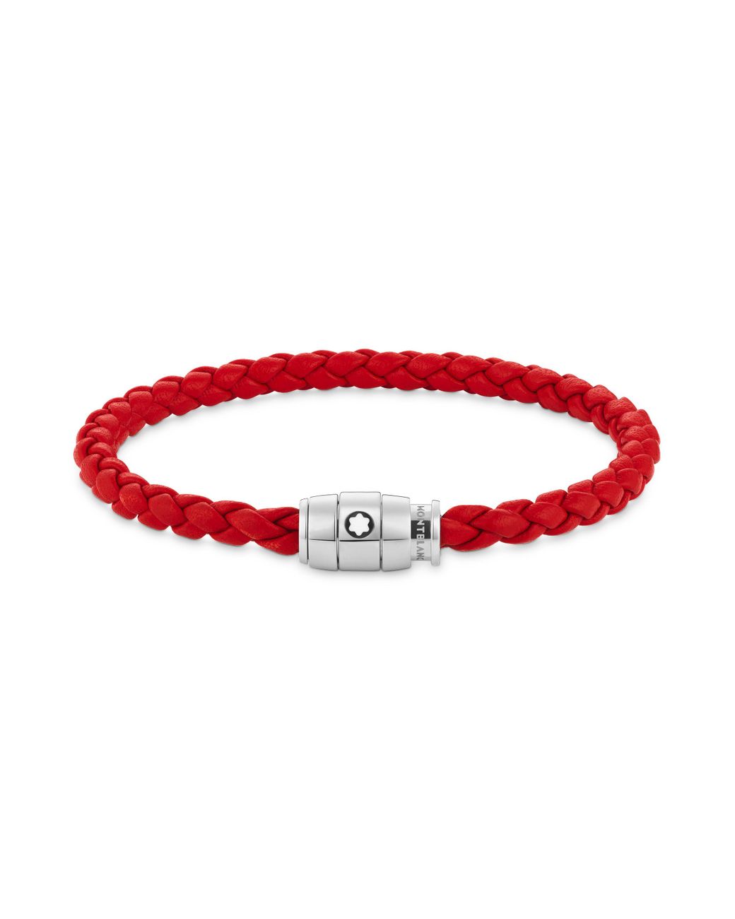 Dieses Schmuckstück aus geflochtenem Leder in Rot verfügt über eine Schließe aus poliertem Edelstahl mit einem Ring aus Stahl mit Montblanc Emblem. Farbe: rot