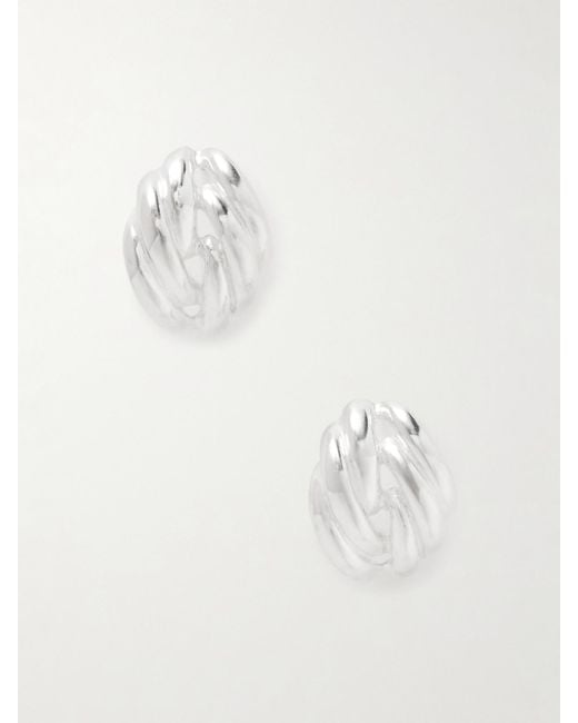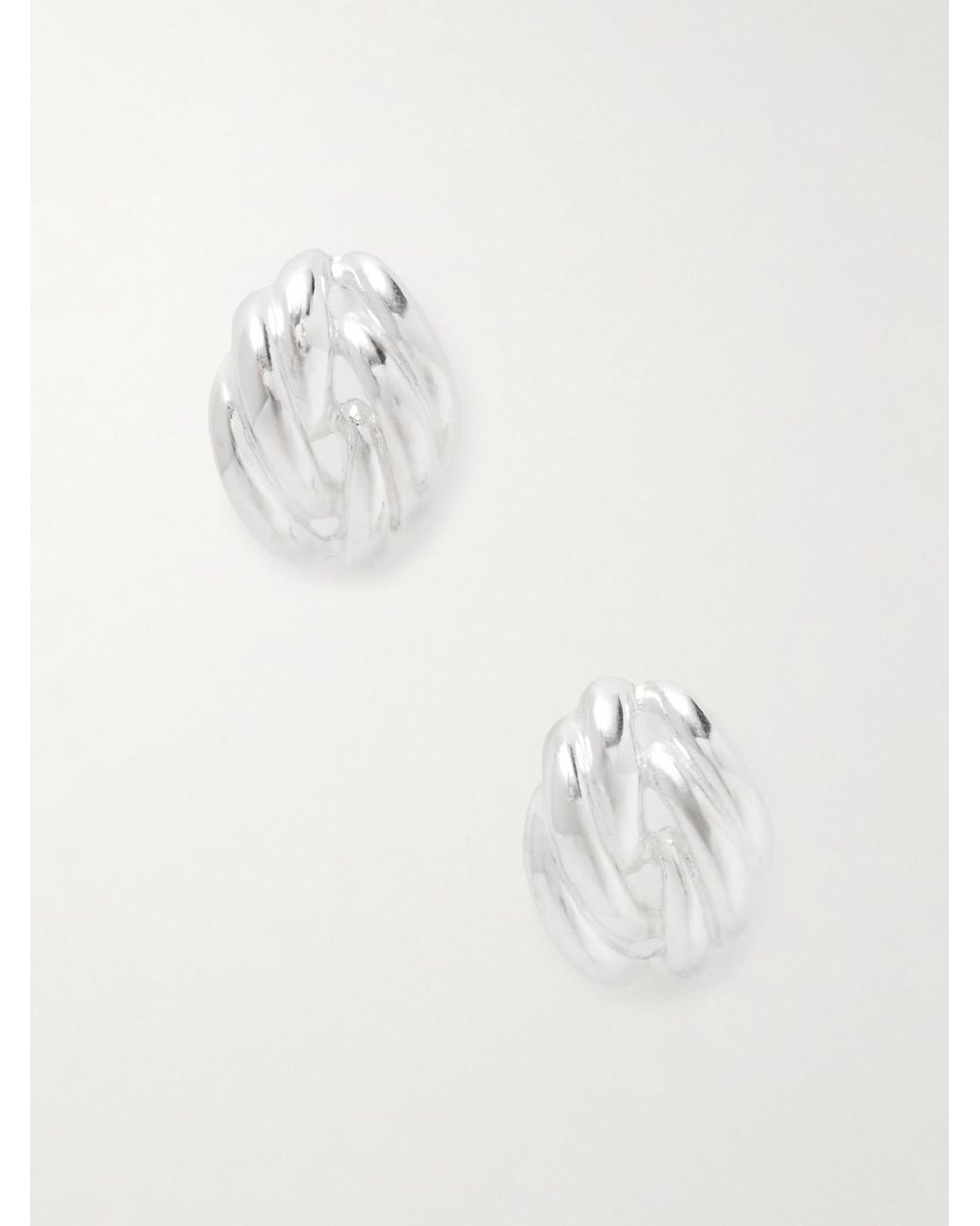 Die „Clos“ Ohrringe von YSSO sind laut Aussage des Labels eine Liebeserklärung an fließende Formen. Sie wurden aus poliertem Silber gänzlich handgefertigt. Für die zeitgemäße Form schöpfte das Team Inspiration aus aufwendigen Techniken, die bei der Herstellung von Teppichen und Knotenseilen zum Einsatz kommen. Farbe: weiß