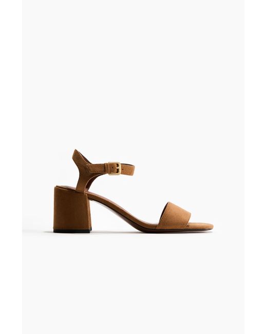 Heeled sandals with square toes, a wide foot strap, an adjustable ankle strap with a metal buckle, and covered block heels. Farbe: weiß