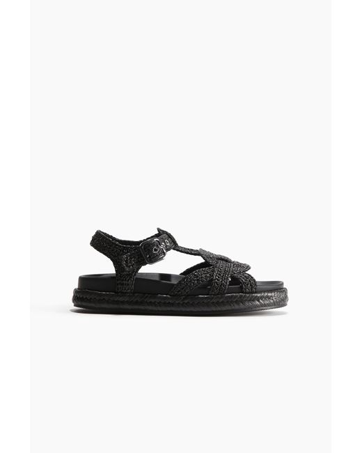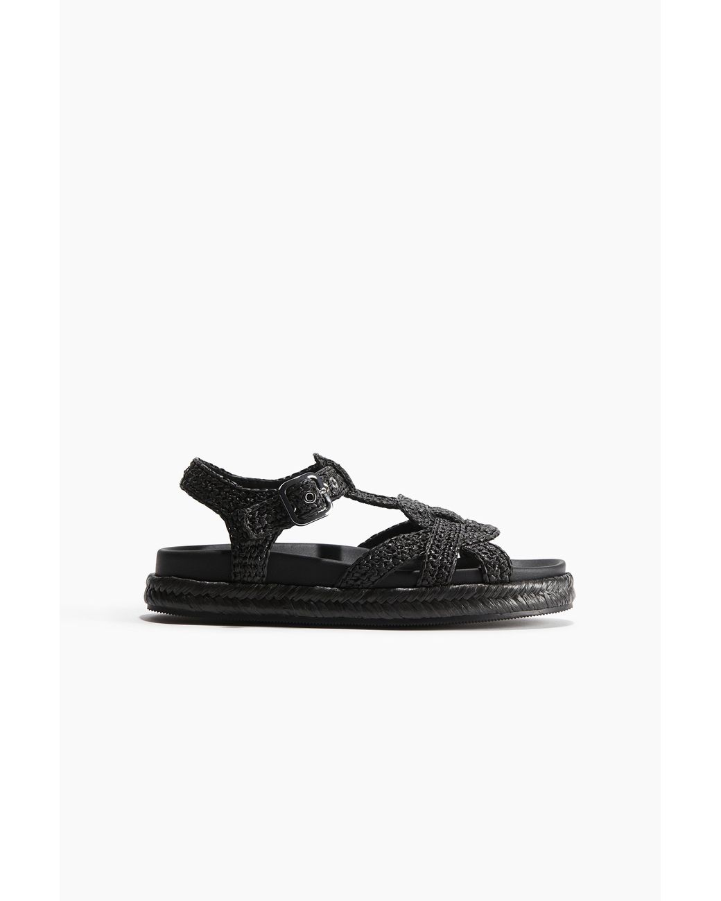 Flechtsandalen mit abgerundeter Spitze und einem verstellbaren Knöchelriemen mit Metallschnalle. Vorgeformte Innensohle und ein geflochtenes Band am Sohlenrand. Farbe: schwarz