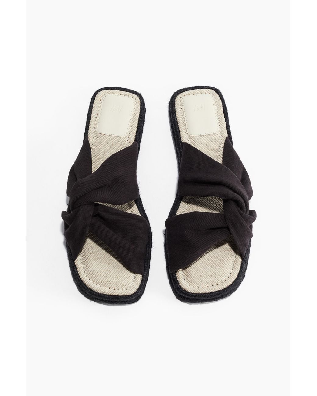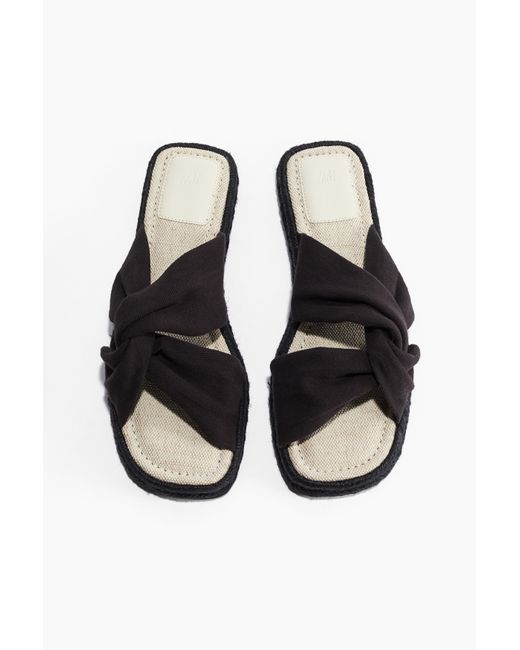 Sandalen im Espadrille-Stil mit eckiger Zehenpartie und verschlungenen Fussriemen. Innensohle aus Canvas und geflochtene Jutebänder am Sohlenrand. Farbe: schwarz