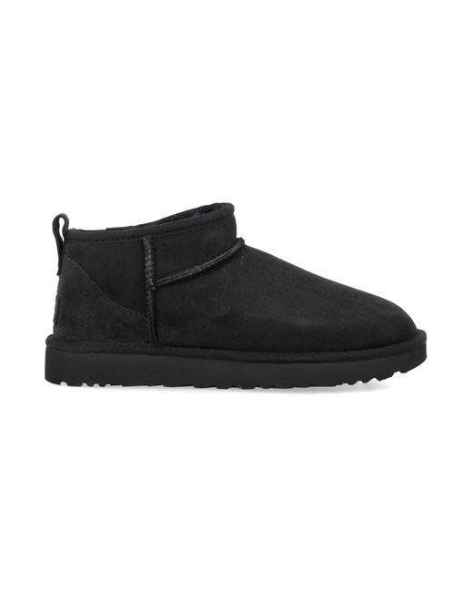Die Classic Ultra Mini-Stiefel von UGG interpretieren die Marke neu. S ikonische Silhouette in einer kürzeren, modernen Version. Sie sind aus weichem Wildleder mit weichem Schaffellfutter gefertigt und verfügen über eine asymmetrische Oberlinie, Overlock-Nähte und eine Zuglasche an der Rückseite für einfaches Tragen. Ausgestattet mit einer leichten EVA-Sohle aus Zuckerrohr und der Treadlite by UGGTM-Technologie bieten sie charakteristischen Komfort und Vielseitigkeit. Obermaterial aus Wildleder. Futter aus Schaffell. Einfaches Slip-On-Design. Asymmetrische Oberlinie. Overlock-Nahtdetails. Hintere Zuglasche. Zuckerrohr-EVA-Außensohle. Treadlite by UGGTM-Außensohle für Dämpfung und Traktion. Fersenetikett aus Leder mit geprägtem UGG®-Logo. Farbe: schwarz