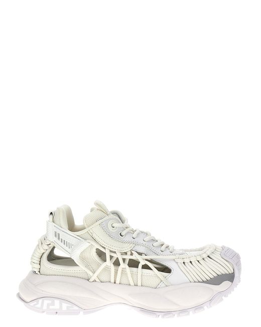 Die Mercury M_VS_01-Sneaker nach Versace sind durch ein futuristisches Design gekennzeichnet, mit einem oberen aus Leder und Stoff mit einem handverkalzierten Kabelgewebe. Sie verfügen über eine Zunge mit silbernen Logo -Schrift und einer Bandzuglasche, einer abnehmbaren Innensohle, dem Code M_VS_01 auf der Ferse und einer Gummi -Sohle mit einem Greca -Muster.