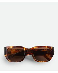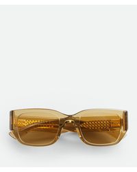 Weiter zu Bottega VenetaQuadratische Sonnenbrille aus Eastman Acetate Renew, einem Acetat mit 27 % Recyclinganteil. Das Gestell besteht aus einem goldfarbenen Drahtkern mit einem charakteristischen Intrecciato Muster. Goldverzierte Details an den Bügeln, die an das Intrecciato