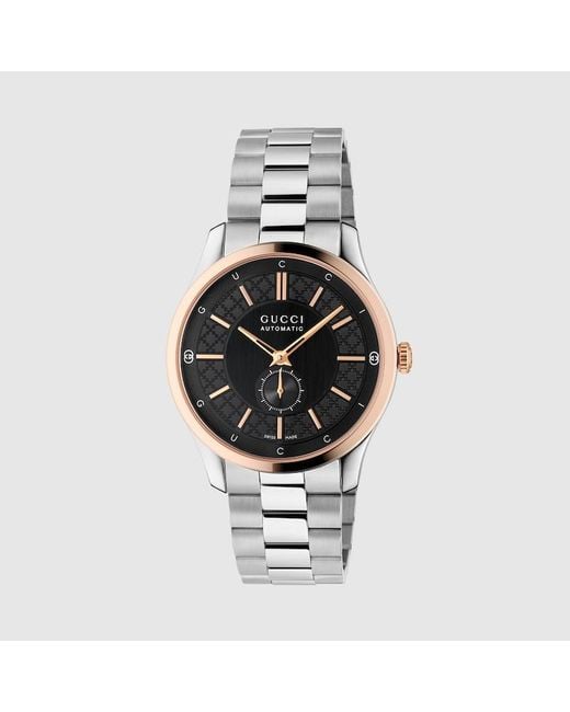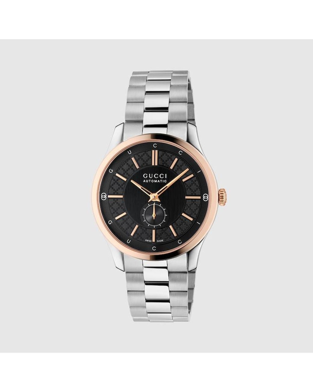 Generation Gucci taucht in die Archivcodes der Marke ein und vereint verschiedene Designgenerationen zu einer ästhetischen Erzählung. G-Timeless präsentiert einen 40-mm-Automatikstil mit einer roségoldbeschichteten Lünette und bringt diskreten Luxus in den Alltag. 40-mm-Gehäuse aus rostfreiem Stahl, Roségoldfarbene Lünette, schwarzes Zifferblatt mit Diamantissima Muster, GG und Gucci Schriftzug, Entspiegeltes Saphirglas, Rostfreier Stahl Armband, Garantiezertifikate für Gucci Uhren, die nach dem Farbe: mettallic