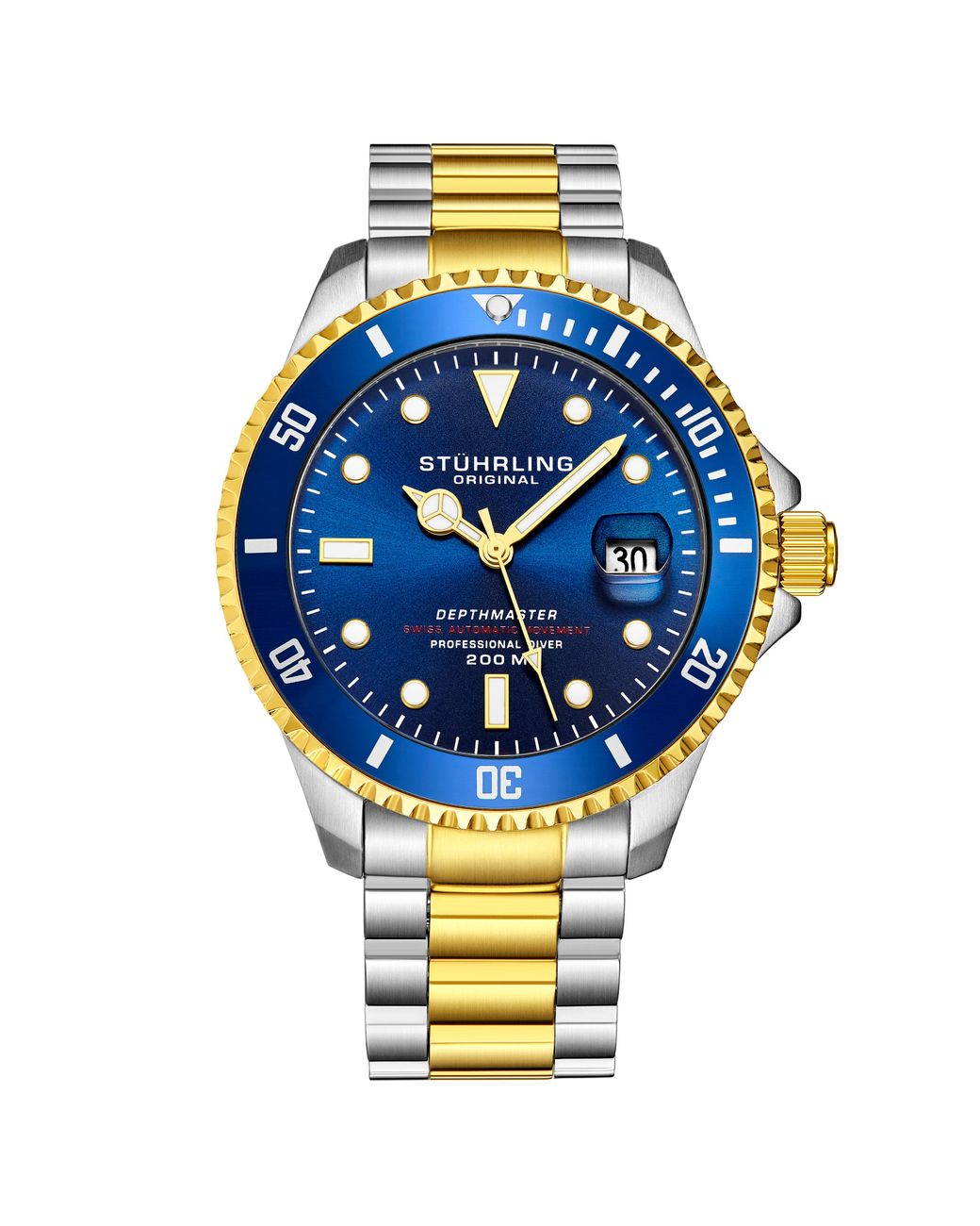 Schweizer Herren-Automatikuhr, Edelstahlgehäuse, blaues Zifferblatt, Gold-/Silbertoner-Edelstahlarmband Farbe: blau