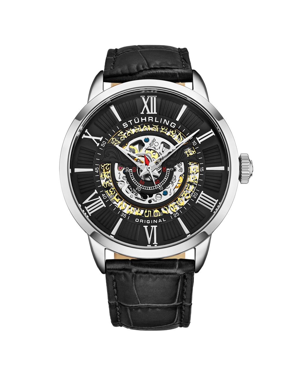 Teilskelettierte Herren-Automatikuhr mit Kalender, silberfarbenes Edelstahlgehäuse, schwarzes Lederarmband mit Alligatorprägung, schwarzes Zifferblatt mit skelettierten Silberzeigern, silberfarbene, rote und goldfarbene Akzente Farbe: grau