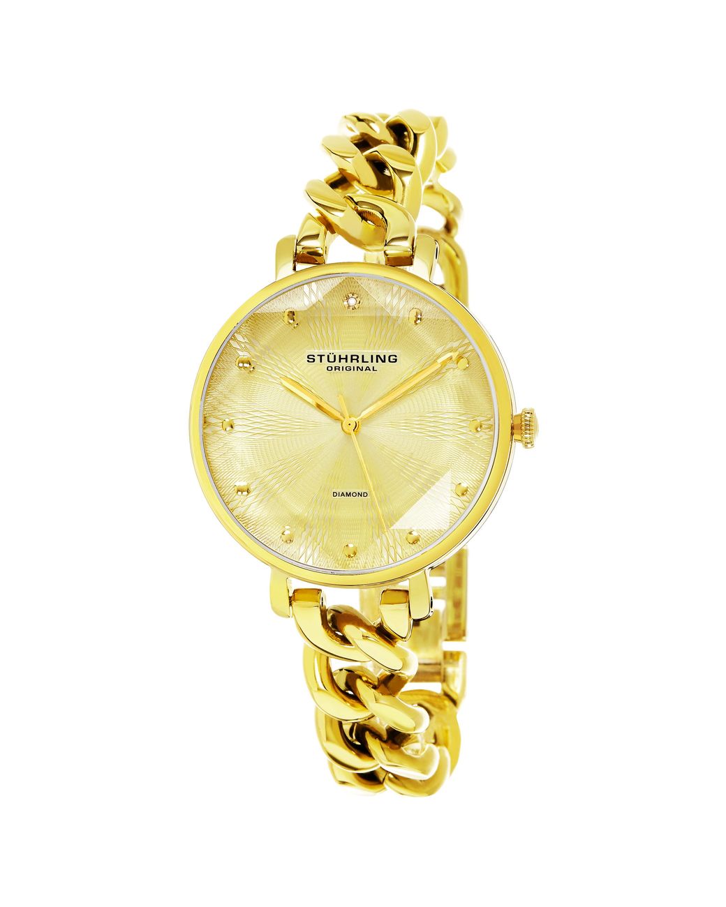 Damen Quarzuhr mit goldfarbenem Gehäuse, facettiertem Kristall, goldfarbenem Zifferblatt mit Diamant-Akzenten und goldfarbenem Gliederarmband Farbe: mettallic