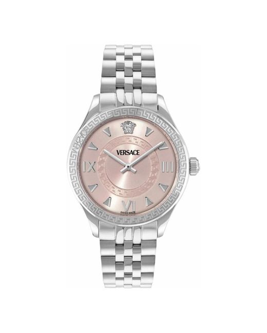 Versace Hellenyium Lady vereint zeitlose Eleganz mit einem rosafarbenen Zifferblatt und einer polierten Edelstahlkonstruktion und bietet raffinierten Stil mit alltäglicher Funktionalität. Hauptmerkmale: Grau | Silber | Edelstahl | Wasserdicht bis 5 bar | Kratzfestes Saphirglas | Quarzwerk | Edelstahlarmband | Rosafarbenes Zifferblatt | Silbernes Gehäuse und Armband | Klassisch elegantes Design | Zusammensetzung & Pflege: Edelstahl | Saphirglas