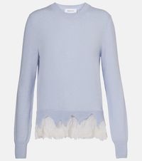 Weiter zu McQueenPullover mit rundhalsausschnitt aus blauem hemdswollkaschmir. Lange ärmel. Elfenbeinfarbene spitze und seidenplissé-creponne-besätze am saum. Farbe: blau