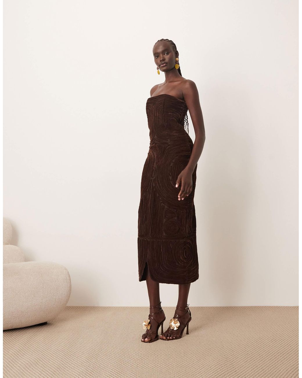 – trägerloses midikleid aus samt mit rouleau-stickerei