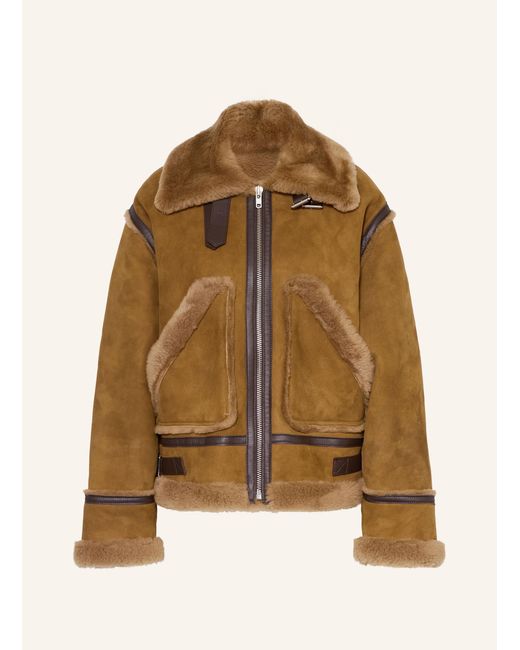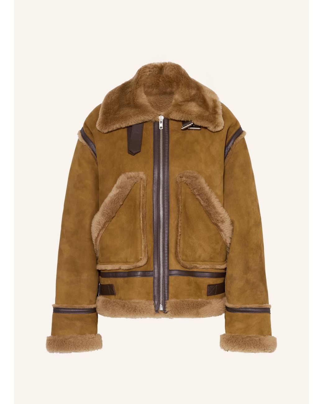 Lange Ärmel. Gerader Schnitt. Berschnittene Schultern. Wärmendes Innenfutter. Weiche Haptik. Umlegekragen. Aus Schaffell. Aus Leder. Bicolor-Design. Aufgesetzte Taschen. Reißverschluss. Unterlegte Verschlussleiste. Aus Veloursleder. Details aus Glattleder. Farbe: natur