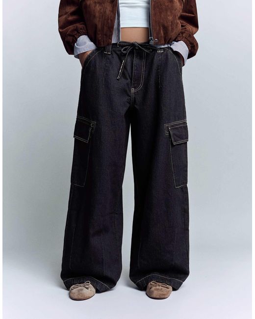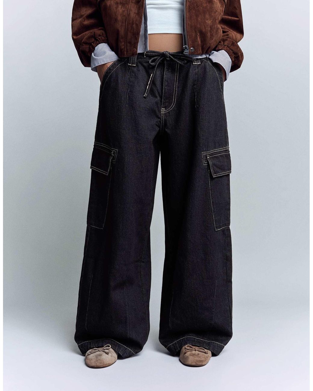 Jeans von Bershka lässige Passform Elastischer Bund Gürtelschlaufen Cargo-Taschen. Farbe: schwarz