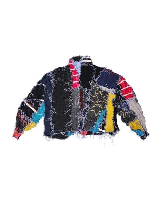Schwarz/Mehrfarbig Patchwork-Design ausgefranste Details lange Ärmel kurzer Stehkragen Size: Einheitsgröße. Gender: Female. Material:Recycled Fabric. Farbe: blau