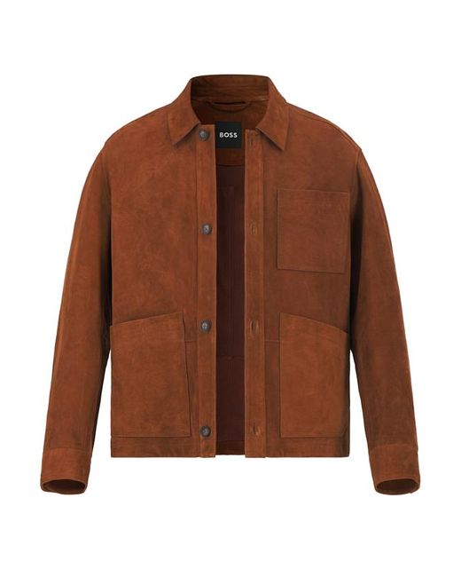 Jacken, braun, Lederjacke,Übergangsjacke, unifarben. Ziegenvelours in warmem Braun mit Nappalan-Finish Das warme Braun dieser ungefütterten Lederjacke erhält durch das Nappalan-Finish eine glatte, edle Optik mit dezentem Glanz. Das feine Ziegenvelours fühlt sich butterweich an und passt sich durch seine natürliche Flexibilität perfekt der Körperform an. Der gerade Schnitt mit Umlegekragen macht die Jacke zum idealen Begleiter für urbane Business-Casual-Looks. Aufgesetzte Seitentaschen und eine Brusttasche links bieten praktischen Stauraum, während die geknöpften Ärmelabschlüsse für einen cleanen Abschluss sorgen. BOSS Black zeigt mit diesem Modell seine Expertise für luxuriöse Lederwaren - deutsche Präzision trifft auf italienisches Handwerk und moderne Schnittführung. Ideal für die Übergangszeit, wenn ein leichter Layer über Hemd oder Pullover genügt. Unser Tipp: Kombinieren Sie die Jacke zu einer dunklen Jeans und weißem T-Shirt für einen entspannten City-Look. Obermaterial: Veloursleder , Ziegenleder Vorderteil: Mit Umlegekragen und Knopfleiste, seitlich aufgesetzte Taschen, aufgesetzte Bruttasche links, geknöpfter Ärmelabschluss Tags: Nachhaltig Maße: Bei Größe 50 Rückenlänge ca. 66 cm, Brustweite ca. 118 cm, Ärmellänge ca. 65 cm Besonderheiten: Nur Lederspezialreinigung Leder ist ein Naturprodukt: Dadurch bedingte Unebenheiten sowie Struktur- und Farbunterschiede sind möglich Modell: Markuedo Farbe: braun