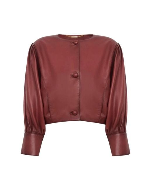 Die Chloé Kurze, kragenlose Jacke aus Leder kombiniert weiches Plongé-Nappa-Lammleder mit Dreiviertel-Puffärmeln für eine raffinierte, aussagekräftige äußere Schicht. Die Jacke ist als kurze Silhouette geschnitten und eignet sich sowohl für gehobene Tages- als auch für Abendoutfits. Hauptmerkmale: Gebrannte Hennafarbe | Lammleder | Lederbezogene Knöpfe | Verdeckte Seitentaschen | Innere Knöpfe aus Wasserbüffelhorn | Kragenloser, runder Ausschnitt | Dreiviertel-Puffärmel | Kurze Silhouette | Plongé-Nappa-Finish | Maße & Passform: Kurze Passform | Zusammensetzung & Pflege: 100% Lammleder | 100% Cupro (Futter) | 100% Wasserbüffelhorn (innere Knöpfe) | Nicht waschen. Nicht bleichen, bügeln, chemisch reinigen oder im Wäschetrockner trocknen. Überlassen Sie die Reinigung und Pflege einem Lederspezialisten. Farbe: rot