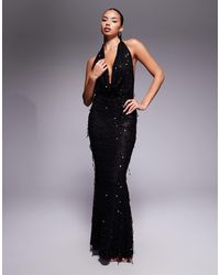 Weiter zu ASOSKleid von Club L roter Teppich nicht inbegriffen Neckholder tiefer Ausschnitt Schlitz am Oberschenkel tiefer Rückenausschnitt Gerafftes Design Normale Passform Fällt normal aus. Farbe: schwarz