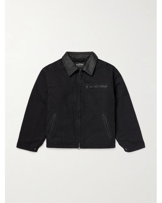 Herren Leather-Trimmed Distressed Padded Cotton-Canvas Jacket in schwarz