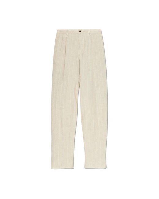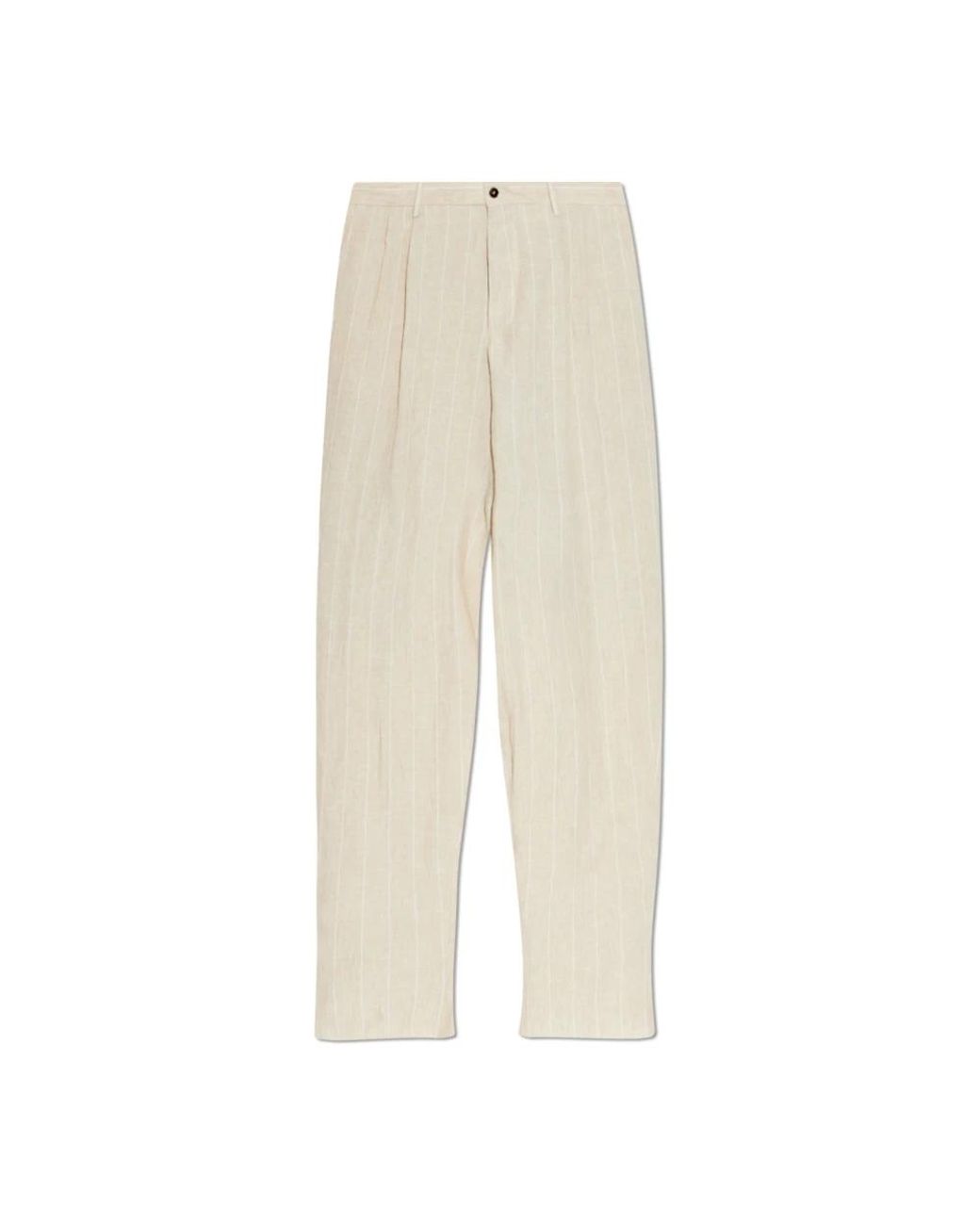 Die Giorgio Armani Linen Pinstripe Trousers kombinieren atmungsaktives Leinen mit einem raffinierten, vertikalen Nadelstreifenmuster für einen entspannten und dennoch eleganten Sommerlook. Der lockere, gerade Schnitt und der leichte Stoff machen sie zu einer vielseitigen Option für warme Tage. Hauptmerkmale: Beige | Cream | Leinen | Atmungsaktives Gewebe | Leicht | Gürtelschlaufen für individuelles Styling | Zwei Seitentaschen | Zwei paspelierte Gesäßtaschen mit Knopfverschluss | Vier funktionelle Taschen | Vertikales Nadelstreifenmuster | Zwei Bundfalten vorne | Matte Leinenstruktur | Verdeckter Verschluss vorne | Maße & Passform: Modelgröße: 185 cm | Brust: 92 cm | Taille: 74 cm | Hüfte: 91 cm | Model trägt Größe: 50 | Lockere, gerade Passform | Leicht verlängertes Bein | Wide Trousers Style | Zusammensetzung & Pflege: 100% Leinen | Nur chemische Reinigung Farbe: natur