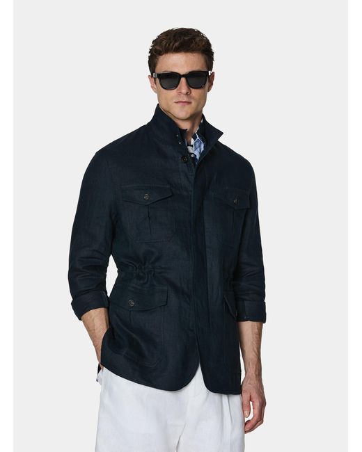 Unsere Field Jacket oder Safarijacke ist das perfekte Kleidungsstück, das über einem Hemd getragen wird und für einen zeitlosen Look sorgt. Sie besteht aus reinem Leinen und verfügt über vier Falttaschen mit Patte und Knopf, einen Frontverschluss mit Doppelreißverschluss und verdeckten Knöpfen sowie geknöpfte Manschetten. Der innenliegende Kordelzug sorgt für eine moderne, figurbetonte Passform. Farbe: blau