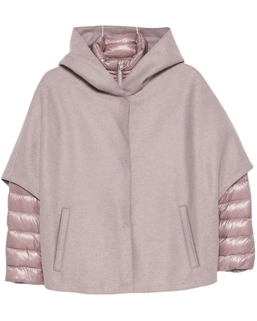 Die Herno-Jacke besticht durch einen eleganten, sanften Rosaton und eine auffällige, capeartige Silhouette, die modernes Design mit klassischen Outerwear-Elementen kombiniert. Sie verfügt über eine gemütliche Kapuze für zusätzliche Wärme und kontrastierende, gesteppte Ärmel, die Textur und visuelles Interesse bieten. Die subtilen, klaren Linien an der Vorderseite und die versteckten Taschen erhöhen die Funktionalität und bewahren gleichzeitig eine elegante Ästhetik. Diese Jacke verkörpert eine anspruchsvolle, aber entspannte Ausstrahlung, die für verschiedene Styling-Optionen im Herbst und Winter geeignet ist. Farbe: braun
