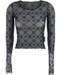 Weiter zu FashionetteVerbessern Sie Ihre Garderobe mit diesem semi-transparenten, elastischen Nylon-Crop-Top von Marine Serre, das ein exklusives Ton-in-Ton-Moonogramm-Logomuster präsentiert. Der runde Ausschnitt und der rohe gewellte Saum verleihen der modernen Silhouette einen avantgardistischen Touch, perfekt