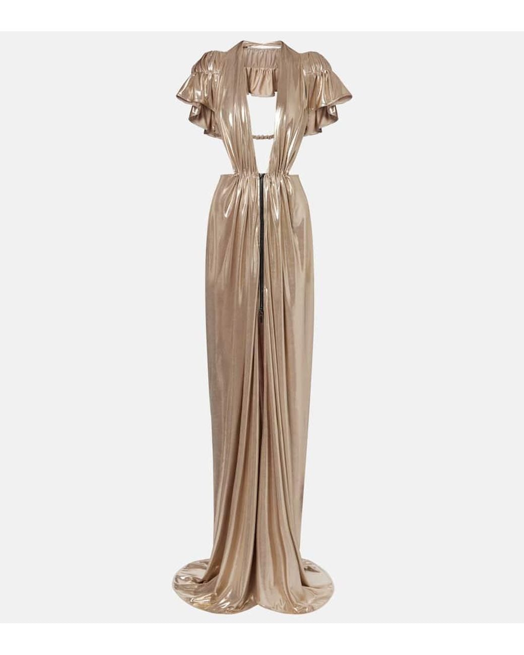 Material: 93% Polyester, 7% Elastan. Pflegehinweis: Handwäsche. Made in Australia. Designer-Farbbezeichnung: Gold. Artikelfarbe: Gold. Verschlussart: Zwei-Wege-Reißverschluss an der Vorderseite. Farbe der Hardware: Schwarz. Langer Gehschlitz.