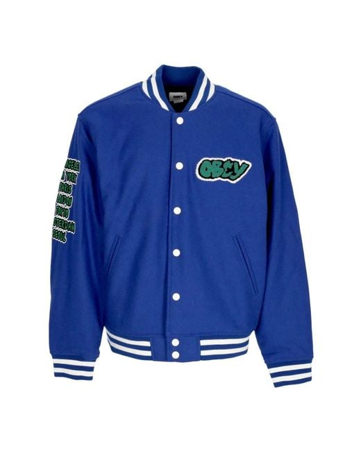 Bleiben Sie mit dieser Obey College Jacket stilvoll und warm. Hergestellt aus Stoff mit gestepptem Futter, verfügt diese Bomberjacke über einen zentralen Verschluss mit Poussoir, zwei Seitentaschen und eine Innentasche. Die gerippten Bündchen, Kragen und Saum sorgen für eine bequeme Passform. Komplett mit Obey Patch Logo auf der linken Seite, übergroßer Patch auf der Rückseite und Stickerei am Ärmel. Stoffzusammensetzung: 63% Wolle, 37% Polyester (100% Polyesterfüllung). Hand- oder maschinenwaschbar (bitte lesen Sie das Etikett). Farbe: blau