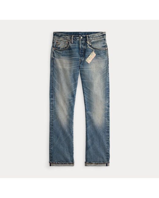 In den USA aus in Tennessee angebauter Baumwolle gefertigte Slim-Fit Bootcut-Jeans. Das Garn wird in Japan ringgesponnen und mit echtem, speziell entwickeltem Indigo mit Rot-Blau-Stich stranggefärbt. Der 16 oz. schwere Rechtsgratköper wird in Japan auf hölzernen Vintage-Schützenwebstühlen gewebt. Von Denim aus den 1930er-Jahren inspirierte Selvedge-Konstruktion und Waschung. Handgefertigt in einem Prozess mit bis zu 50 einzelnen Arbeitsschritten unter Einsatz spezieller Werkzeuge und Techniken. Verdeckte Knopfleiste. Sanforized, um Einlaufen zu minimieren. Farbe: blau
