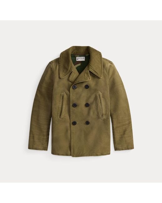 Aus strapazierfähigem Ripsbandgewebe gefertigt, das traditionell für Fliegerbekleidung verwendet wurde. Camouflage-bedrucktes Baumwoll-Moleskin-Futter am Hauptteil. Corozo-Knöpfe mit Ankergravur. Vorgewaschen für einen Vintage-Look. Farbe: grün