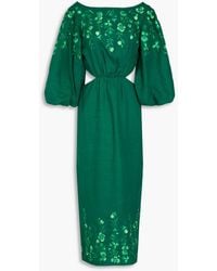 Weiter zu NET-A-PORTERDas „Zoey“ Midikleid von Saloni zeichnet sich durch den farbenfrohen „Thistledown Candy“-Print aus. Das Baumwollmodell zeigt sich mit schicker Lochstickerei und im Hüftbereich mit großen aufgesetzten Taschen. Es wurde hinten zudem mit einem