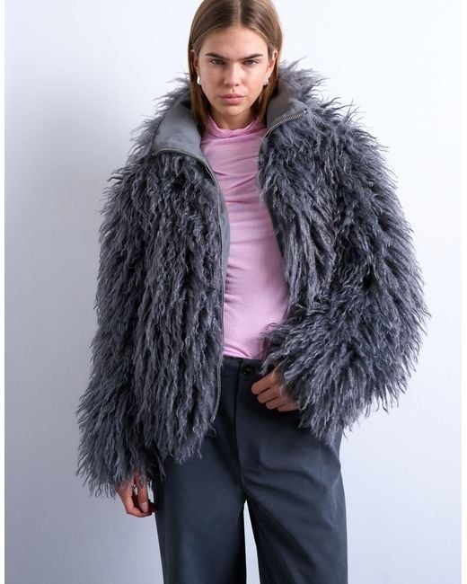 Mäntel & Jacken von Topshop Dieser Mantel ist aus einem strukturierten, zotteligem Kunstpelz gefertigt. Das Modell im Relaxed Fit zeigt sich mit einem hohen Ausschnitt und einem Reißverschluss. Farbe: blau