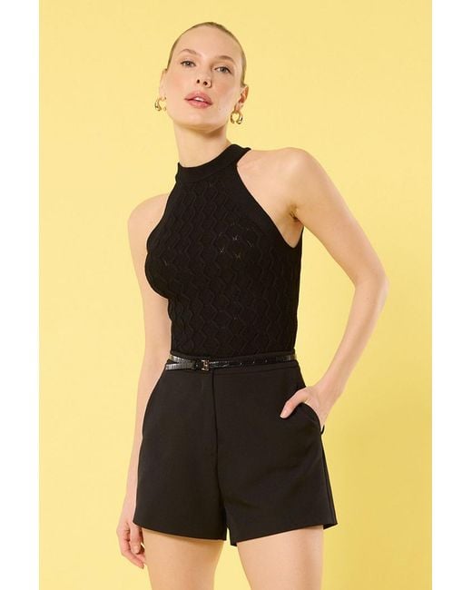 Schwarze, Dünne Strickbluse Mit Neckholder-Aufdruck Für Damen