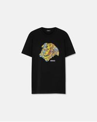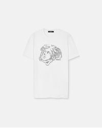 Weiter zu VersaceDieses kurzärmlige T-Shirt aus Baumwolljersey zeigt eine Medusa Study-Grafik, die einer Zeichnung der Medusa ähnelt und mit Kristallen, Pailletten und Lurexgarnstickerei verziert ist. Farbe: schwarz