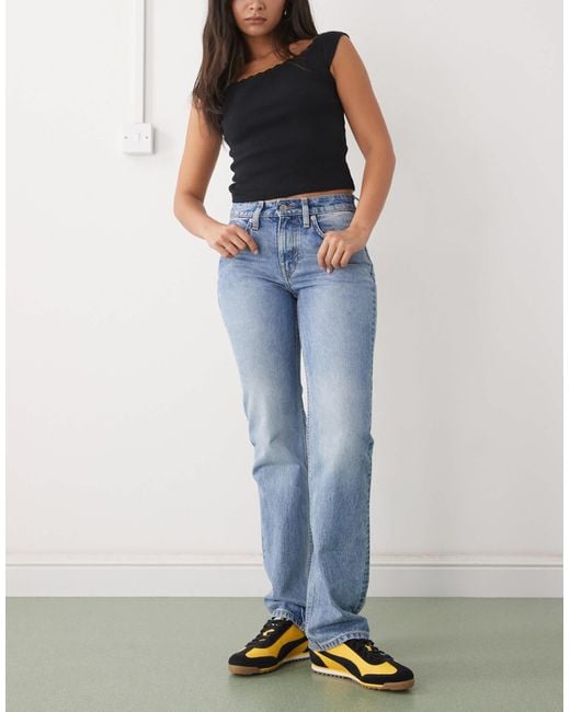 Jeans von Weekday gerade geschnitten Gürtelschlaufen Funktionale Taschen Weekday-Markenetikett hinten. Farbe: blau
