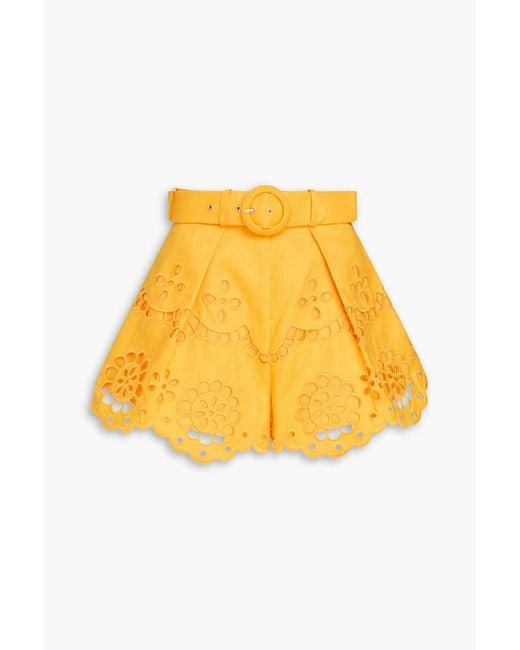 Damen Shorts aus leinen mit lochstickerei und gürtel in gelb