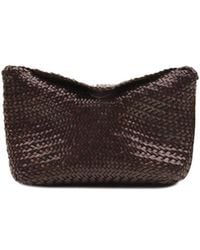 Weiter zu BalardiDrachendiffusion Frauens Kleine Bambus-Triple-Jump-Tasche – rot, in einem Stück von Meisterwebern handgefertigt. Die Struktur besteht aus einem diagonalen Chevron-Gewebe aus glattem Büffelkalbsleder. Die Tasche ist als breiter handgeflochtener Korb gestaltet und verfügt über
